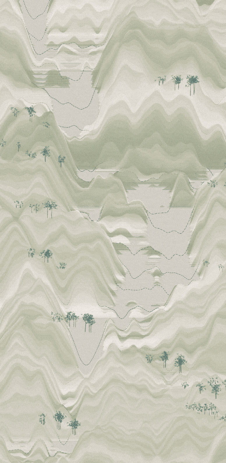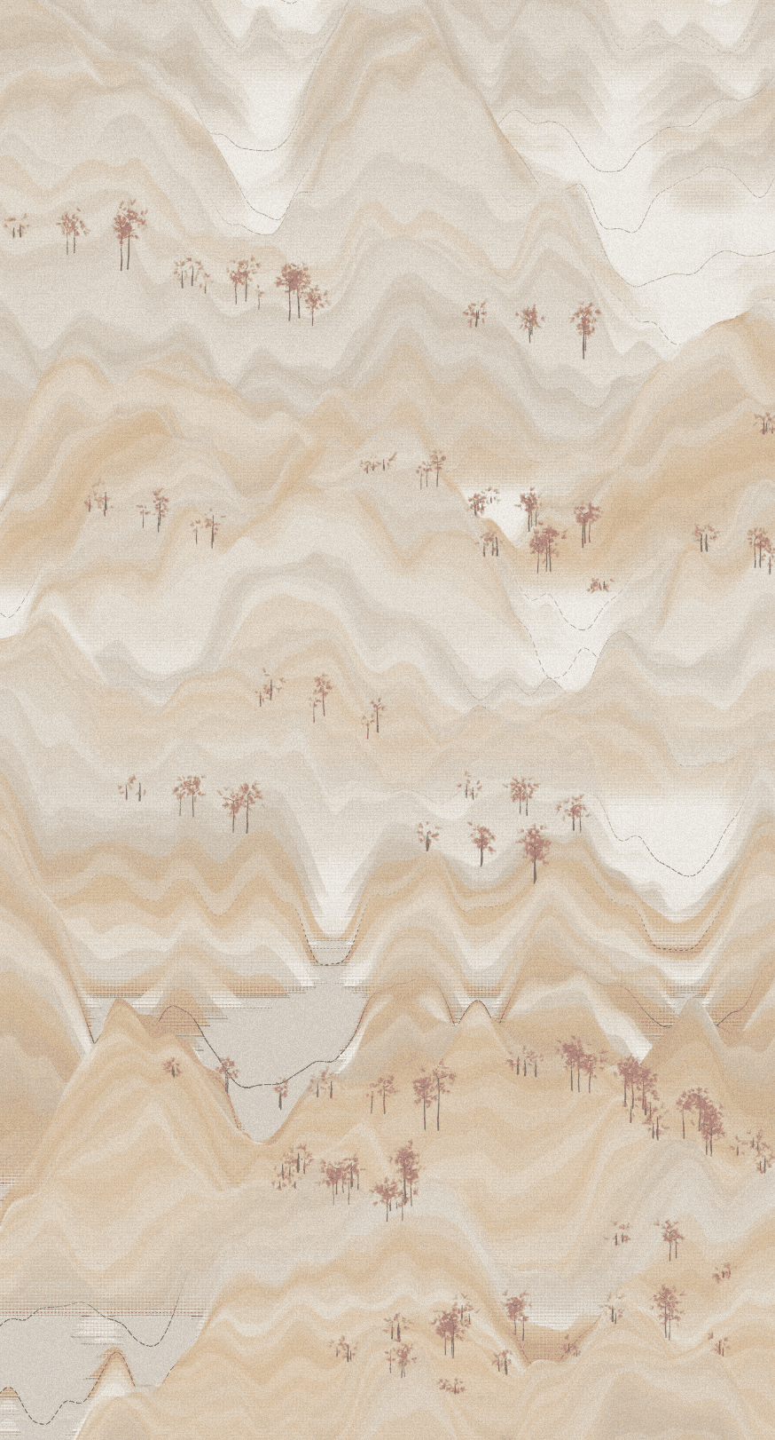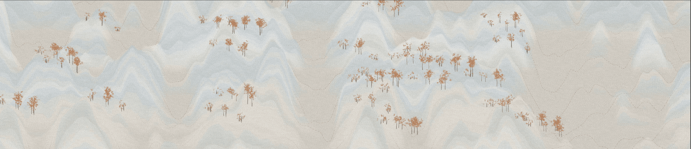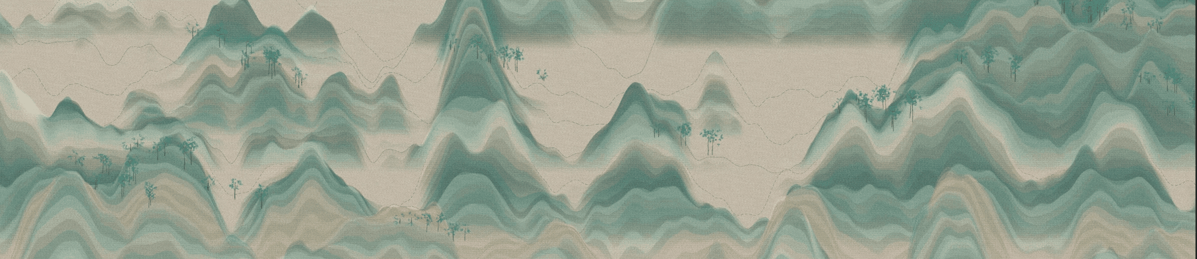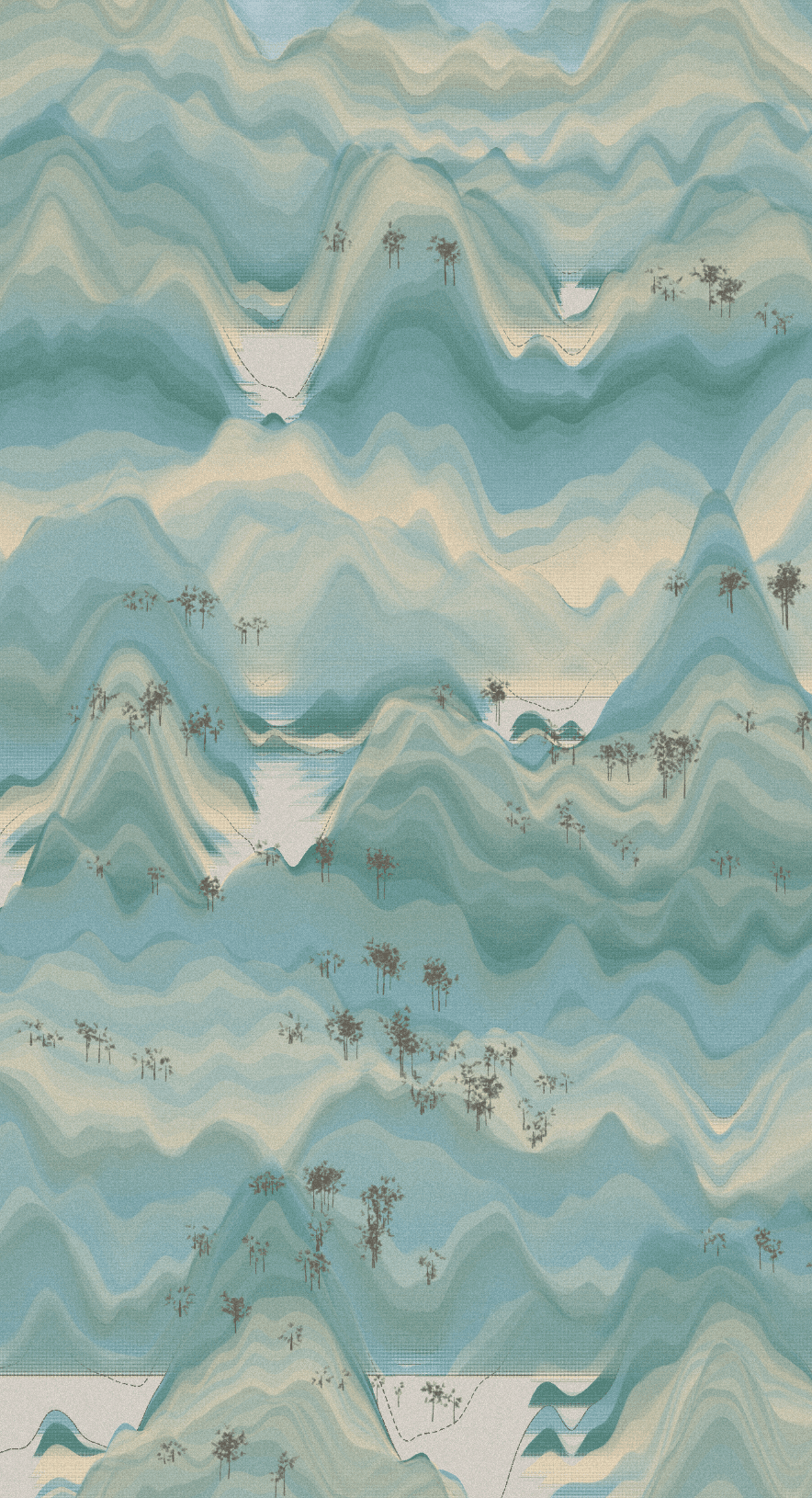 Much like C.C. Wang, I use randomness so that each composition generates layers of sine waves, selects colors from palettes I created, and determines where and how many trees to place.