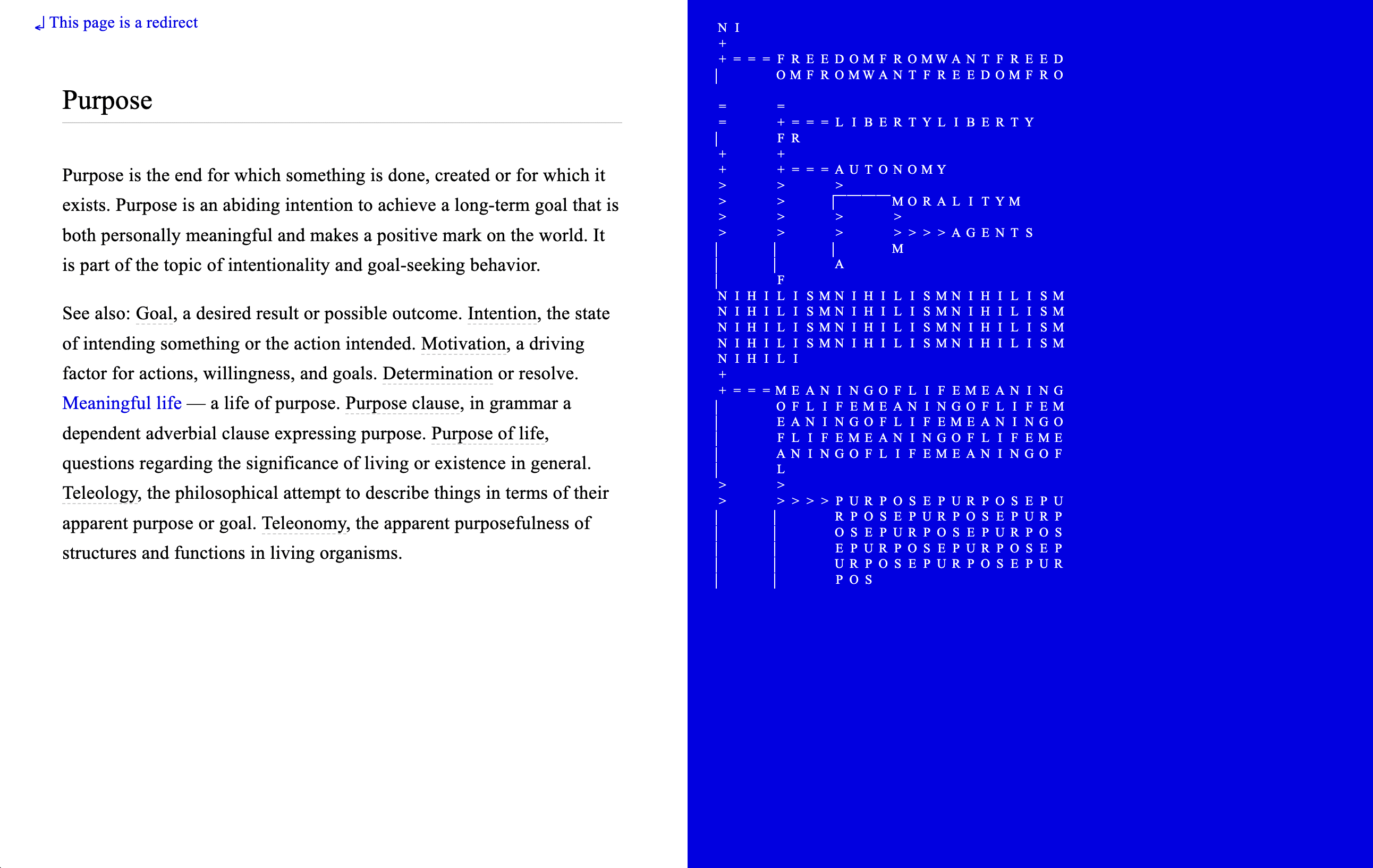 As you click into different pages, a viewport on the right tracks the word you clicked on and maps 1 second spent on said page to a character being added to the overall structure.